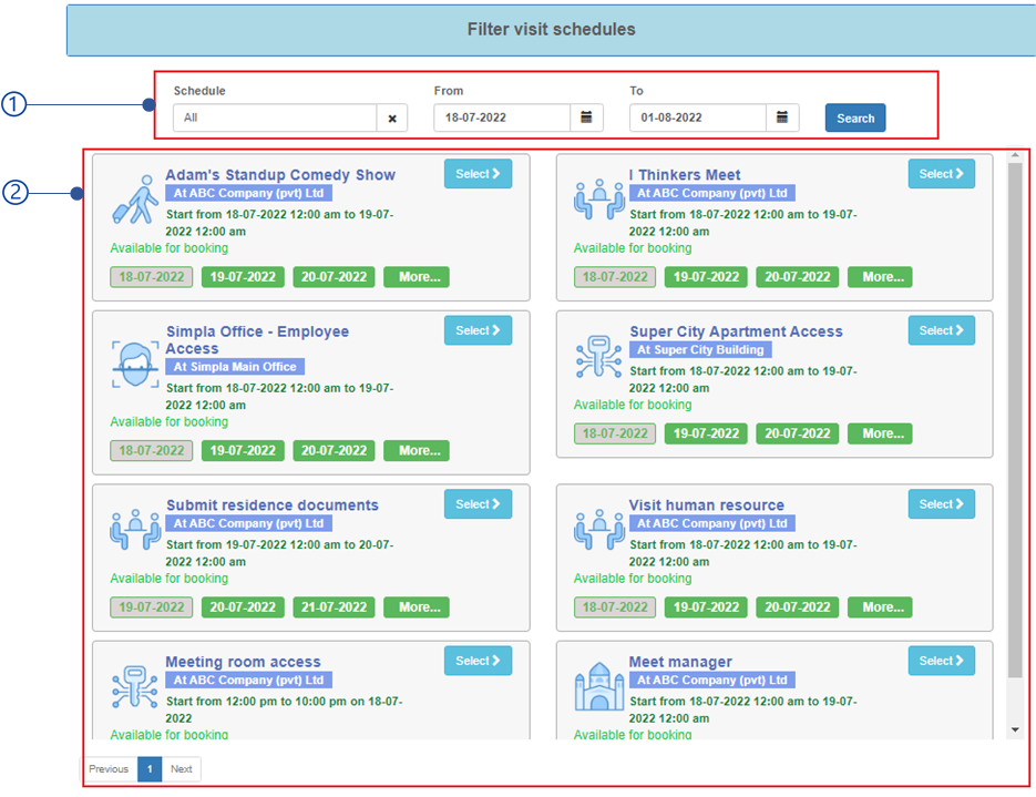 Filter schedules simplify appointment creations from online or walk-in kiosks when there are large number of schedules available. Filter schedule view is shown below. This page can be accessed from the following URL. {server}:{port}/web/public/template/schedule_selection_public/html/{customer Code}