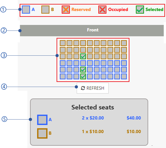 All seatings groups are showing in specific color with the group name as configured in the Pricing configuration .